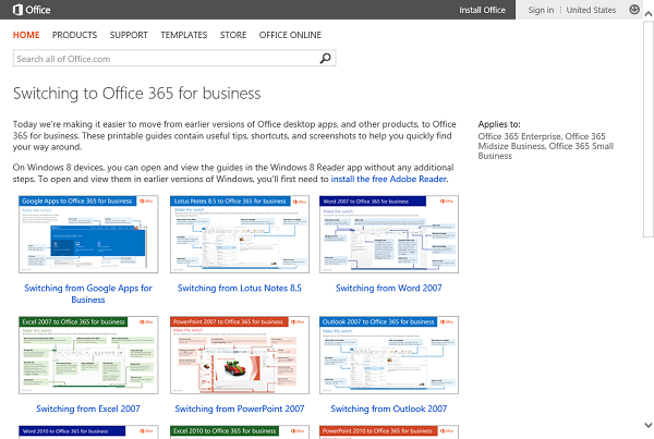 A set of step-by-step guides that explain Office 365 features to users which migrate from Google Apps for Business, Lotus Notes or older versions of Office to new versions of Office programs which are part of Office 365. Common new functions are explained with screenshots and useful tips. All guides can be downloaded and printed (in PDF file format), from link posted below.