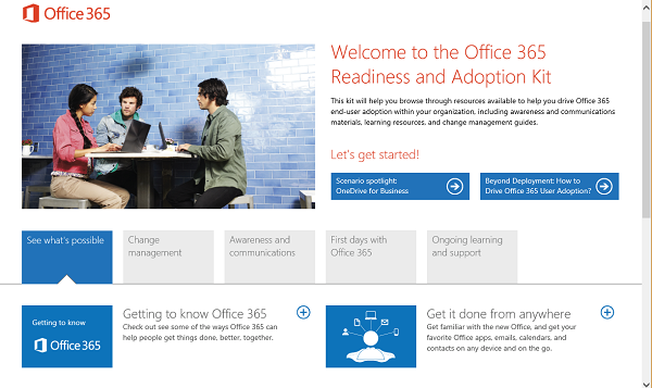 It contains lot of useful content that can help you during your entire Office365 project, from planning phase until its implementation and afterwards. Some of the resources included are: implementation planning workbook template, links to how-to videos, guides for end users, presentations, printable flyer templates and email templates that can be used to promote your new Office365 project to your internal audience. This kit can be downloaded as zip file from the link below.
